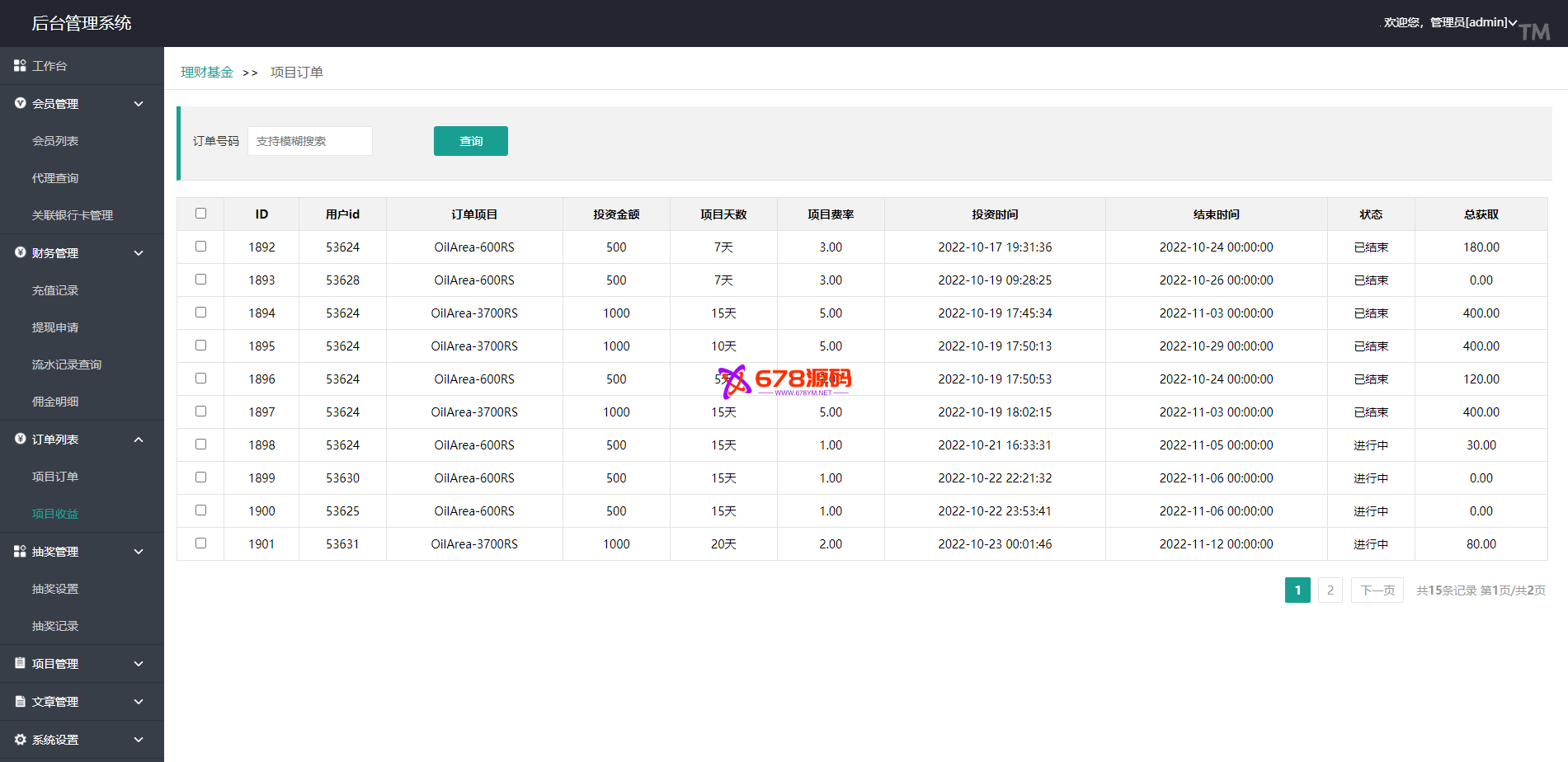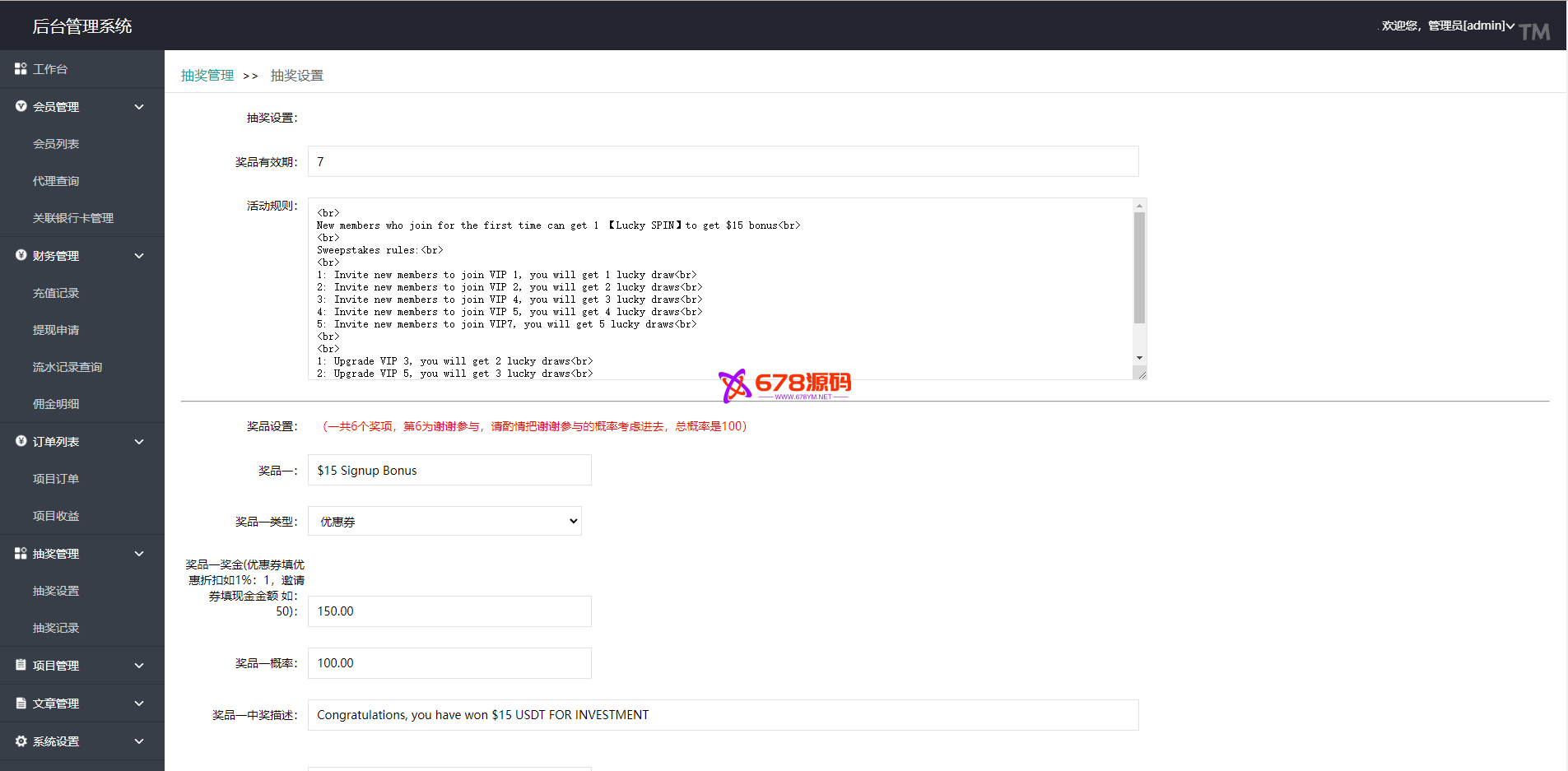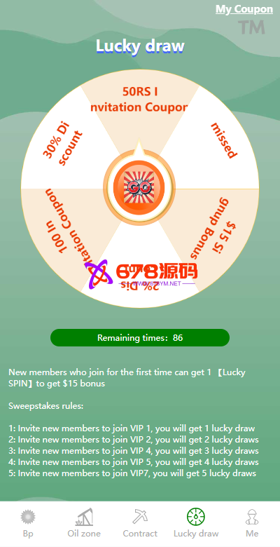转盘:一共6个奖项,第6为谢谢参与,谢谢参与的概率考虑进去,总概率是100 ,.代理后台团队查询,每天返利 ,到期还本,附加脚本。邀请投资1级分佣 邀请投资2级分佣 邀请投资3级