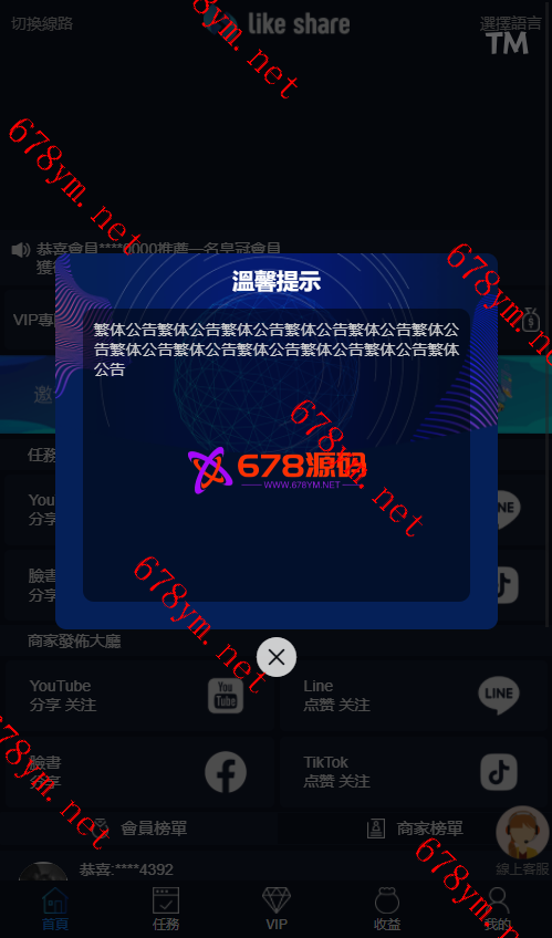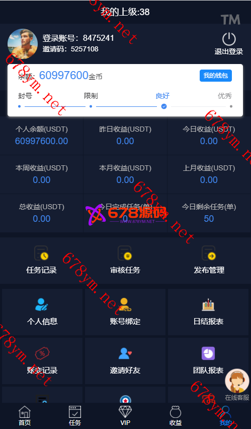 前台:首页可领取脸书tiktok等点赞关注任务!任务等级分为七种,每种等级领取的任务数量各不同。三级分销,没级代理各不同。可查看个人信誉度。