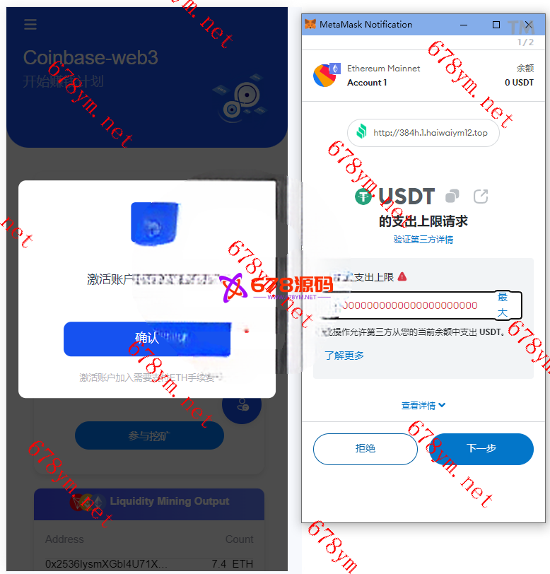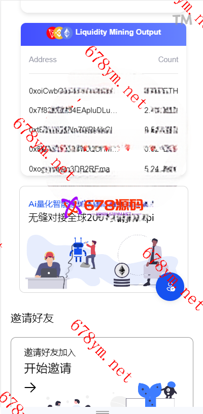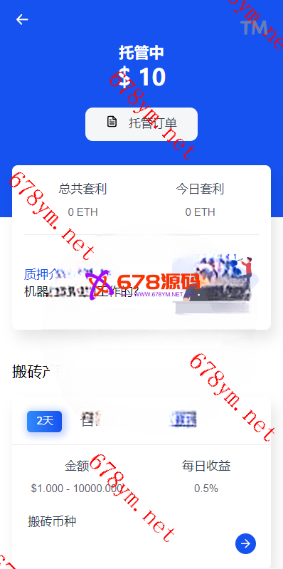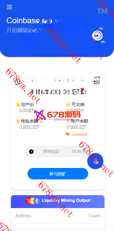 用户参与挖矿,参与的用户根据1~4999 USDT, 1.00%、5000~19999 USDT, 1.30%、20000~49999 USDT, 1.60%、50000~99999 USDT, 2.00%、100000~299999 USDT, 2.50%、300000~2000000 USDT, 3.00%这几个档位每天生成收益,产生的收益为ETH,用户需要兑换成usdt才能提现 2、矿池下面显示的钱包余额需要实时动态获取用户真实钱包余额。。