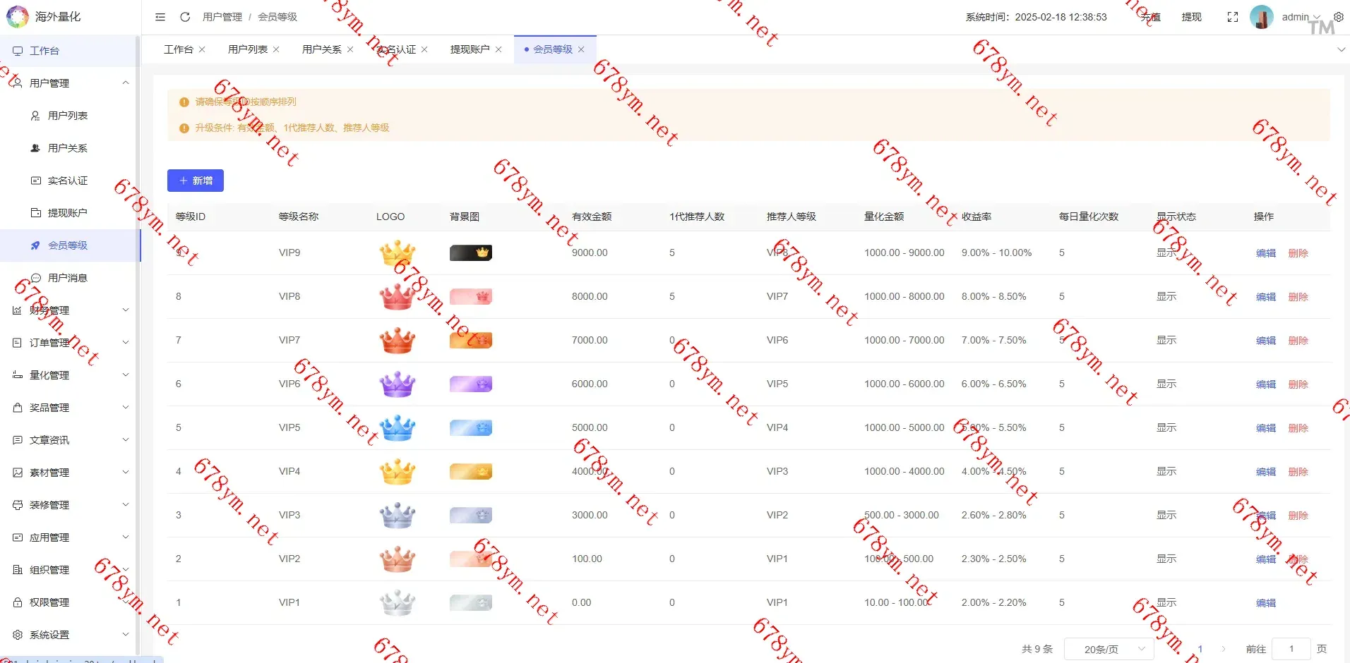 3、VIP等级划分,升级条件: 用户有效金额、1代推荐人数、推荐人等级