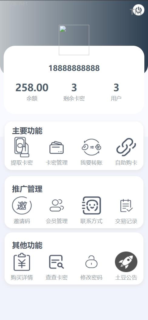 2.代理后台用余额生成卡密,代理之间可以互相转让余额,比如:代理A转给代理B100余额, 1余额=1张月卡,2余额=1张季卡。6余额=1张年卡