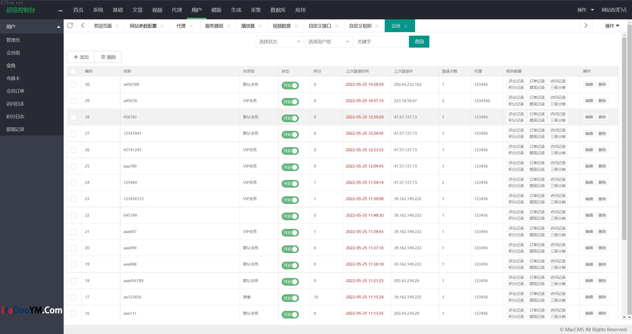 3.代理后台可以查看使用此邀请码注册的会员信息,(账号、密码、卡密激活时间、)并且可以修改会员密码
